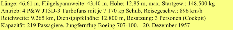 Es wurden 1.010 Boeing 707 in verschiedenen zivilen und militärischen Versionen ausgeliefert; heute spielt die Boeing 707 im zivilen Luftverkehr keine große Rolle mehr.