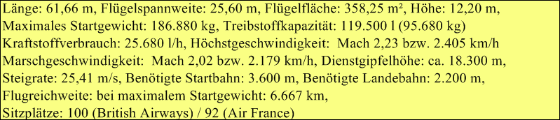 Die Flugzeit auf ihren wichtigsten Strecken über den Atlantik zwischen Paris beziehungsweise London und New York betrug mit etwa 3 bis 3,5 Stunden etwa die Hälfte moderner Unterschallflugzeuge, hierbei wurden Flughöhe von bis zu 18 km erreicht.