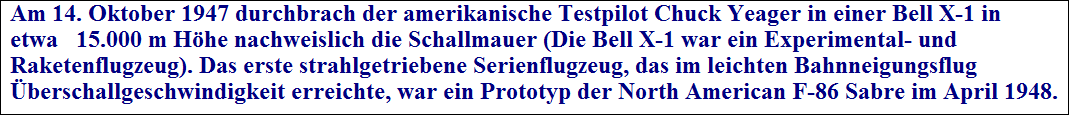 Am 1. Oktober 1947 durchbrach George Welch mit einem Prototypen der North American F-86 Sabre im 40-Grad-Sturzflug die Schallmauer. Da der Geschwindigkeitsmesser aber nicht auf die entsprechende Höhe kalibriert war und auch keine Geschwindigkeitsmessung vom Boden aus stattfand, wurde der Flug offiziell nicht gewertet.