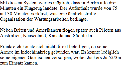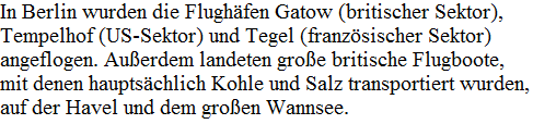 Im Gegensatz zu Landverbindungen nach Berlin gab es über die drei jeweils. 32 km breiten Luftkorridore einen Vertrag, der den Alliierten ausdrücklich, deren freie Nutzung zusicherte.